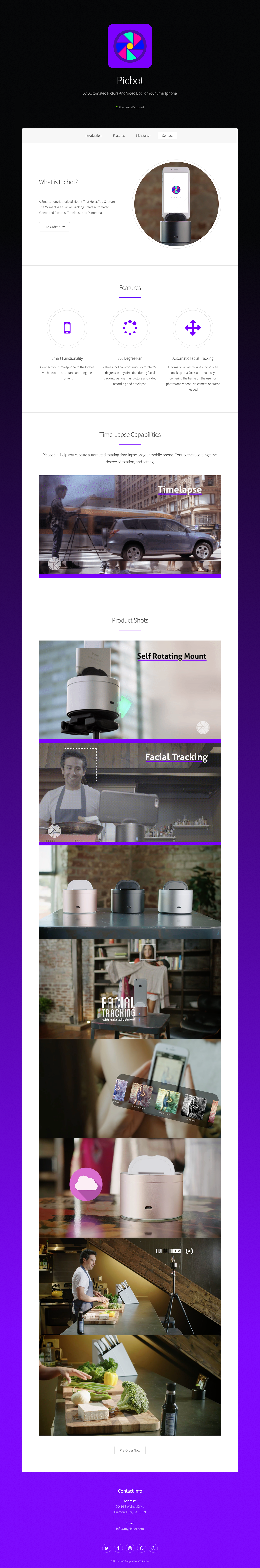 Landing page build and design for a mini robot camera that included subject tracking and other useful features. This project included design and layout, curating and providing shot lists for the shoots, and creating feature animations from the shots with some motion graphics work.